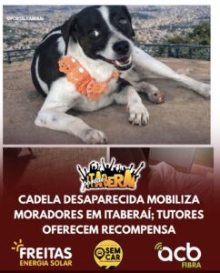 Uma cadela está desaparecida em Itaberaí e os tutores pedem a ajuda da população para localizá-la. O animal, que atende pelo nome de Bolinha, foi