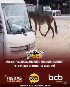 Uma cena curiosa chamou a atenção de moradores nesta sexta-feira (27): uma mula foi vista caminhando tranquilamente pela Praça Central de Itaberaí, como se estivesse
