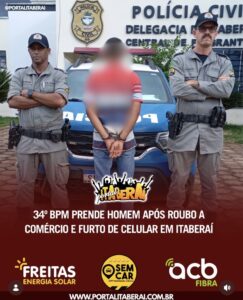 Equipes do 34° BPM agiram rápido e prenderam um homem suspeito de envolvimento em um roubo a comércio e no furto de um aparelho